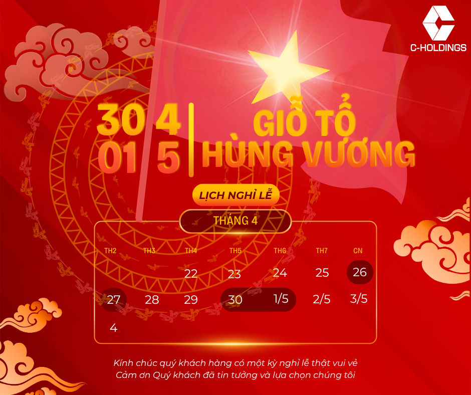 Nhằm tạo điều kiện để toàn thể Cán bộ Nhân viên có thời gian nghỉ ngơi, sum họp cùng gia đình, đồng thời tri ân các giá trị truyền thống dân tộc, Công ty Cổ phần C-Holdings xin trân trọng thông báo đến Quý Khách hàng và Đối tác lịch nghỉ lễ nhân dịp Giỗ Tổ Hùng Vương và Ngày Giải phóng miền Nam 30/4 như sau: